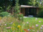 Formal box shapes and single stemmed birch and flowering cherries punctuate an informal wildflower planting around a contemporary garden room in this suburban location.